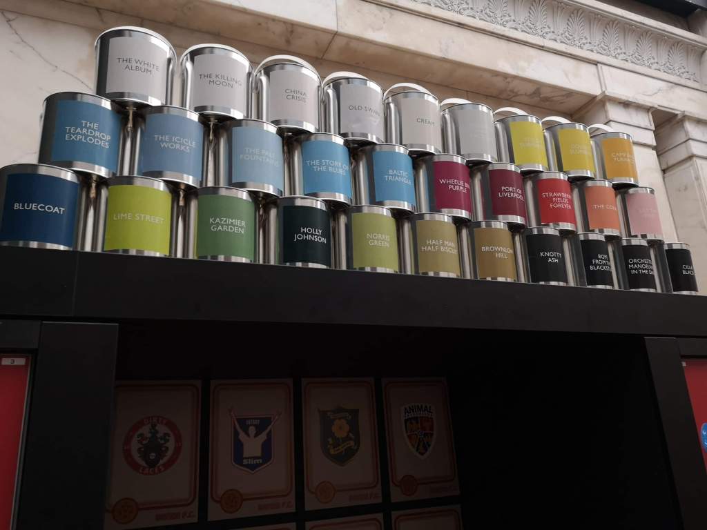 There is a return of Dorothy’s ‘The Colours of Liverpool’ concept too, this time as an installation. Opposite the cafe-bar you will find three rows of tins of paint neatly stacked. Read the labels carefully. Each tin is a reference to a famous landmark, band or song. You can imagine decorating your front room with a tin of ‘The White Album’ and doing a feature wall in ‘The Story of the Blues’. Simultaneously simple and ingenious.