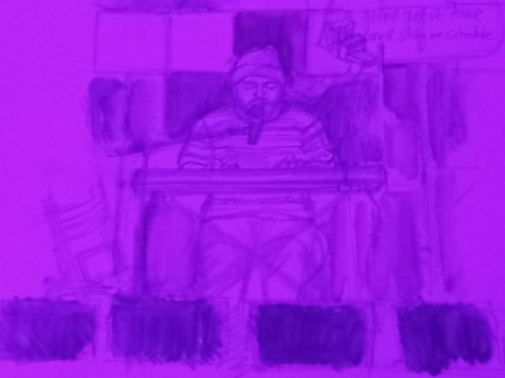 Sean’s vocal style lay somewhere between Dean Friedman and David O’Doherty. Sean at the Hotel was walking a musical tightrope. It seemed like at any point he might fall off into a net of self indulgence, but somehow, he never did. To add to the quirkiness of the performance, stood next to me was an artist sketching the gig, something I had never witnessed before. So, in the spirit of Sean’s off-kilter performance, rather than showing a photo of him, with the artists permission, here is a photo of that very sketch.