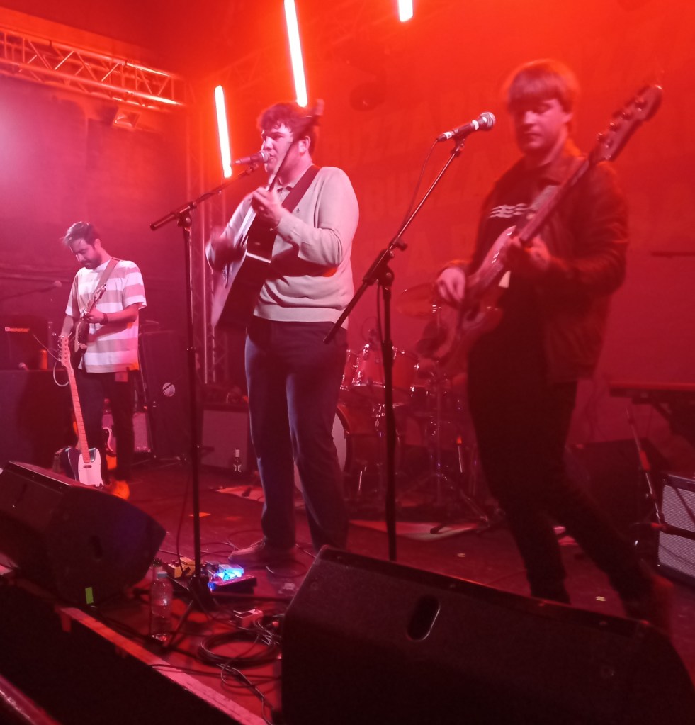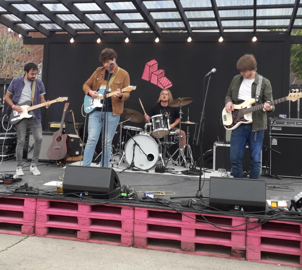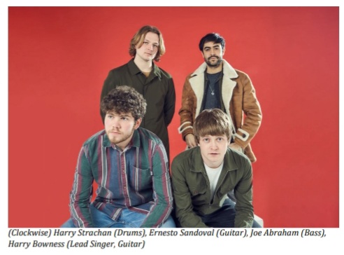 The Merchants are three Wirralians (if you don’t know, look it up!) – Harry Bowness (vocals/guitar), Harry Strachan (drums), Joe Abraham (bass), and a Mexican, Ernesto Sandoval (guitar). I have seen them a few times, usually in the middle order of a local festival, or supporting someone at one of Merseyside’s multifarious venues – most recently Buzzard Buzzard Buzzard at Liverpool Arts Club. Invariably, whoever I have seen the night before, I wake up with one of The Merchants effortlessly catchy tunes still going round my head. Usually it’s the bounding Hostile or their new single Castro. Castro as a song has been part of The Merchants‘ live set for a little while now, but will be released as a single on 21/4/2022.