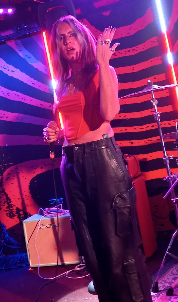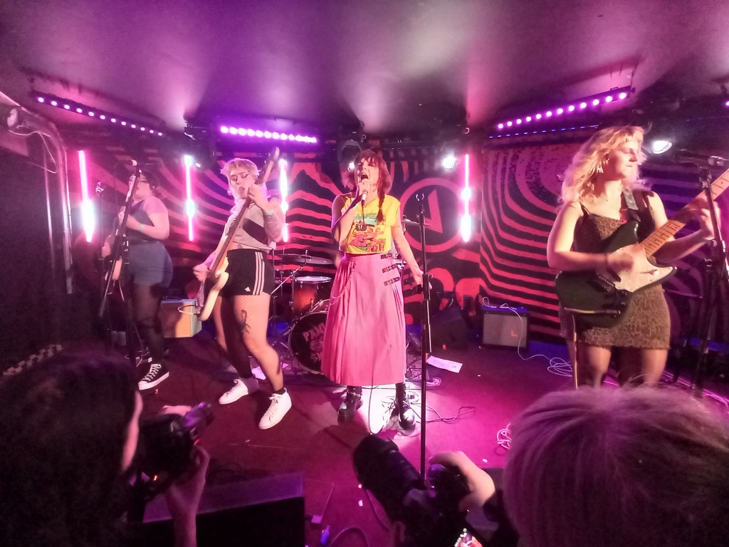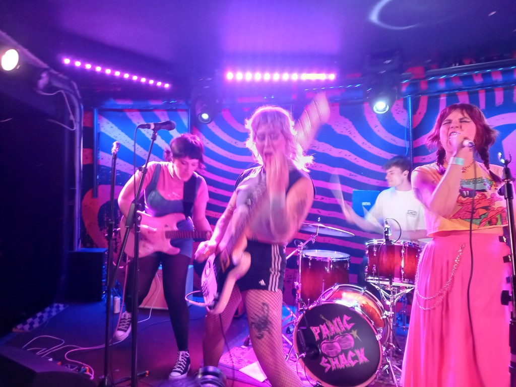 But Panic Shack also have a genuine depth to their music. Singer Sarah Harvey may be being flippant as she climbs into the audience and asks them what’s their preferred Meal Deal? (answers vary from a KFC to an M&S Halloumi and Humus combo!) but the song itself is a passionate diatribe about people being forced to choose between heating or eating. Equally forceful was the bands performance of I Don’t Really Like It. The song tackles the all too pervasive subject of misogyny. The haunting three part harmonies, Emily Smith’s slowly accelerating bassline, and the songs loudening drum beat build to dramatic effect like a victim’s heartbeat.