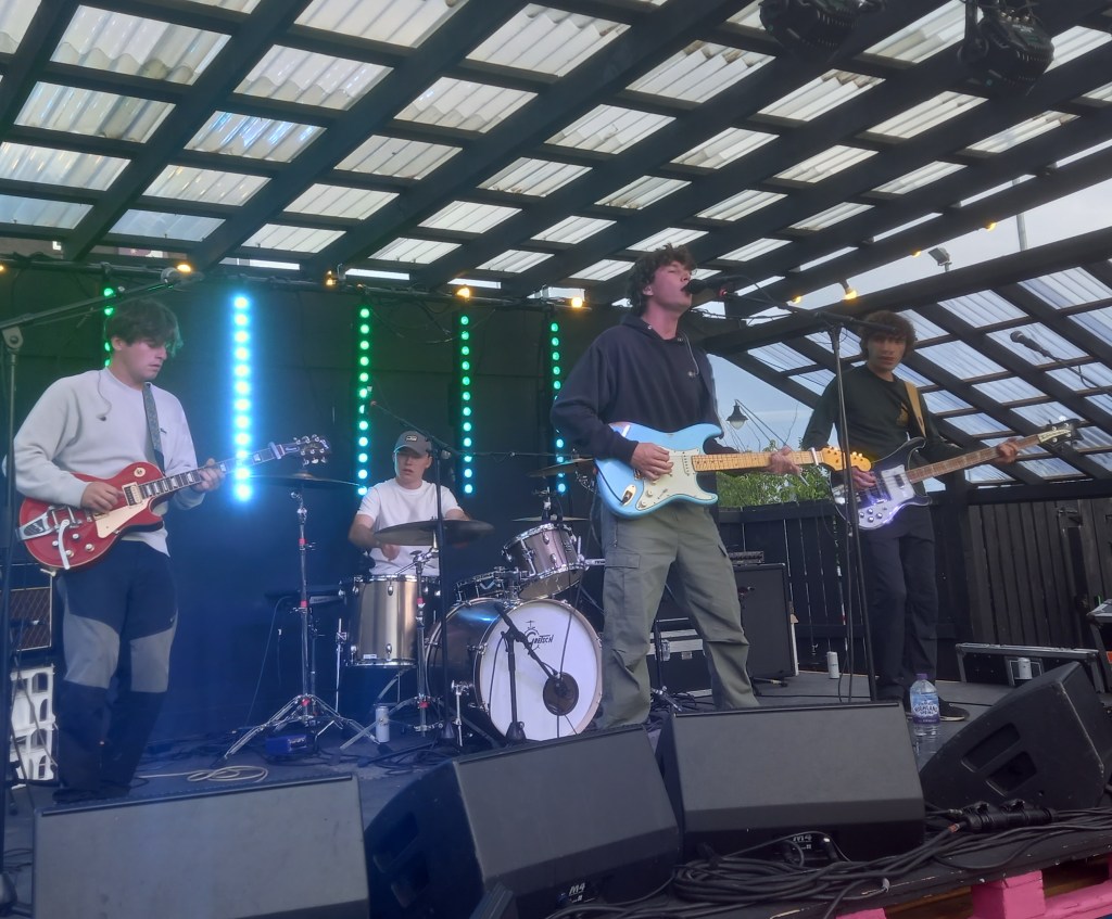 I first saw Andrew Cushin some years ago at The Brudenell in Leeds. At the time he was as an acoustic guitar wielding solo artist. Immediately you could tell he was going places. Since then he’s got a band, gone electric, rubbed shoulders with Paul Weller and Noel Gallagher, and just completed a tour of the US supporting Louis Tomlinson. Tonight he was playing the yard in Future Yard, Birkenhead.