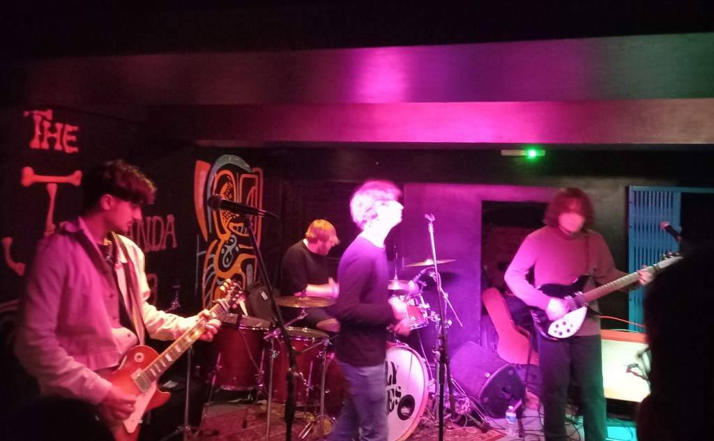 As the evening started, outside it was a wet and wintery 2023, but inside the basement of The Jacaranda, youthful Derby quintet Marseille were doing their best to take us back to the first and second ‘Summer’s of Love’. There’s an element of Byrdslike 60’s psychedelia in there, but the majority of Marseille’s jangly sound owes a big debt to The Stone Roses, The Charlatans, and Northside.