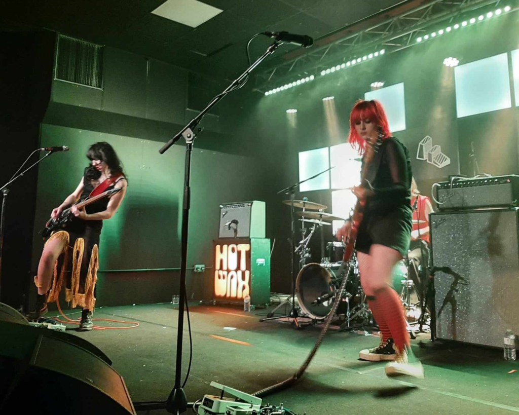 By the end of Hot Wax‘s set I wished that I could have seen a Sky Sports type ‘Heat Map’ for the amount of stage covered by singer/guitarist Tallulah Sim-Savage, and bassist Lola Sam. They metaphorically covered every blade of grass and worked their socks off. Drummer Alfie Sayers played a blinder at the back and was a faultless libero, coming to the fore when the occasion arose.